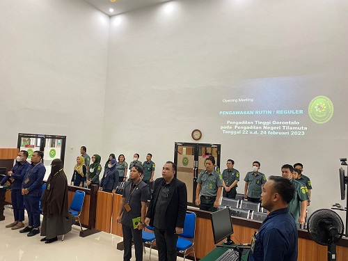 Rabu, 22 Februari 2023 bertempat di Ruang Sidang Pengadilan Negeri Tilamuta, telah dilaksanakan opening meeting pengawasan rutin/reguler Pengadilan Tinggi Gorontalo pada Pengadilan Negeri Tilamuta Tahun 2023. Pada kegiatan ini Wakil Ketua Pengadilan Tinggi Gorontalo selaku ketua tim memberikan sambutan dan memperkenalkan tim pengawasan Pengadilan Tinggi Gorontalo yang terdiri dari 6 anggota. Adapun opening meeting pengawasan reguler dihadiri oleh seluruh hakim, pejabat struktural/fungsional, pegawai, dan honorer Pengadilan Negeri Tilamuta. Pengawasan ini dilaksanakan selama 3 hari, yaitu pada hari Rabu-Jumat, 22-24 Februari 2023. (KN)